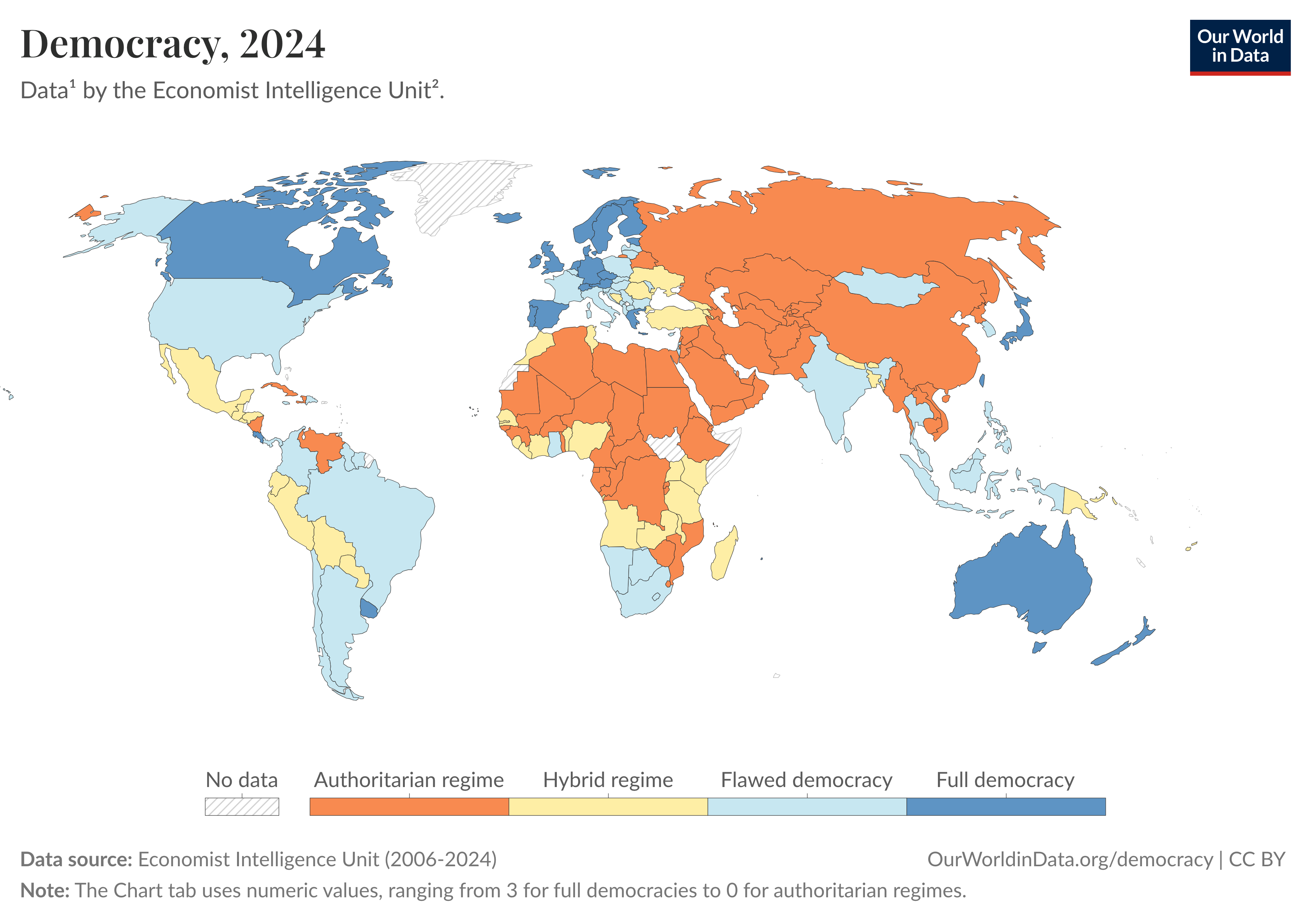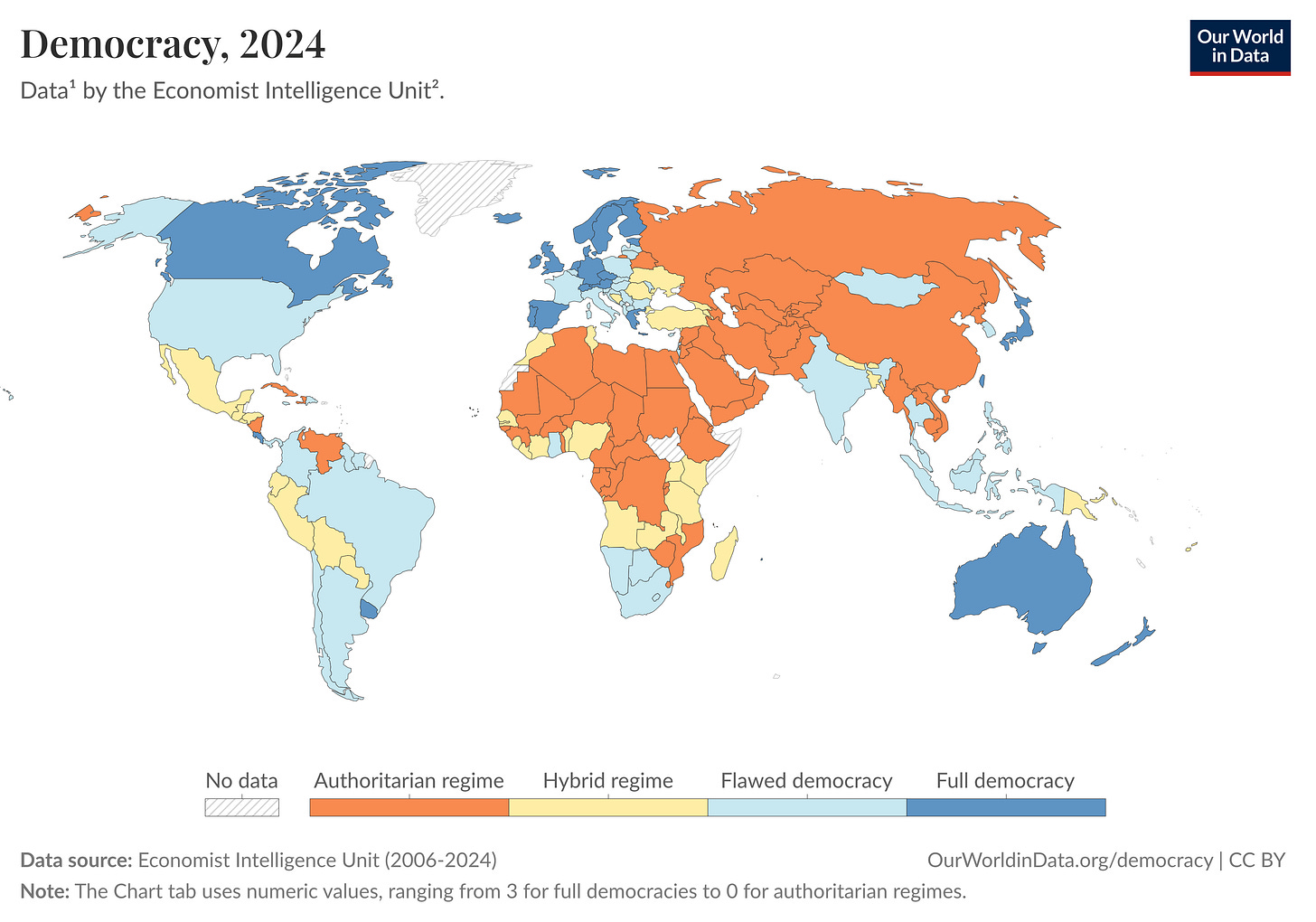 But opposition to one authoritarian government does not ensure a smooth transition to a better form of government. The Arab Spring uprisings, hopeful as they initially were, ended in failures to eliminate authoritarianism across the board. In Egypt it gave way to more repressive government; in Libya it paved the way to civil war; in Syria it sparked a brutal civil war and then a power vacuum; in Tunisia it resulted in a return to dictatorship. Interventions in Iraq and Afghanistan do not have an enviable track record either. Both became bloody fights that lasted well over a decade and gave way to instability and weak government. The Middle East remains hard ground for democracy (see map).